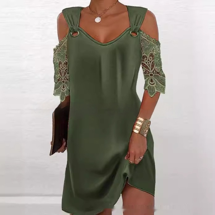 Elara Lockeres Kleid mit V-Ausschnitt und Spitzenärmeln – A-Linie, Polyester, eleganter Stil